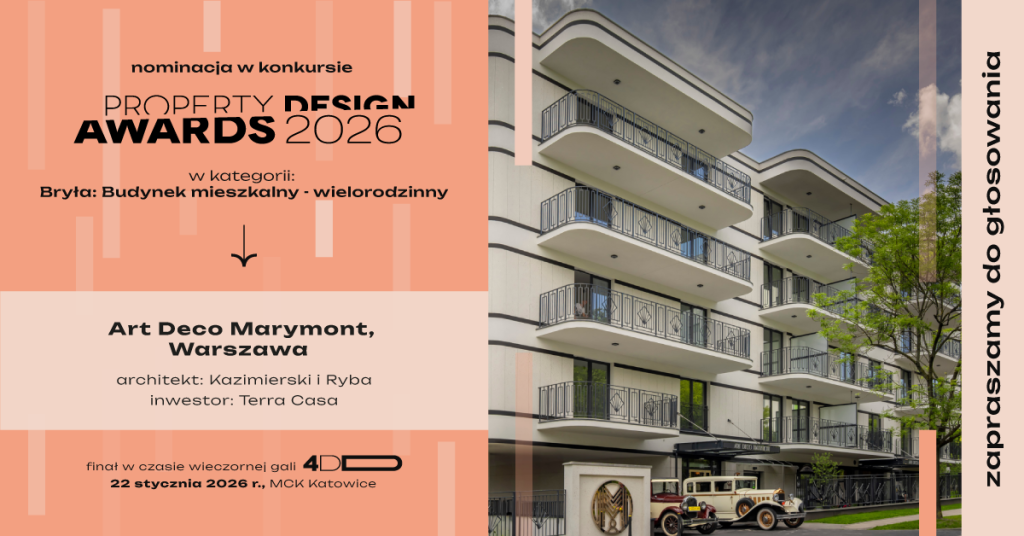To dla nas ważny moment — projekt ART DECO MARYMONT znalazł się wśród nominowanych do Property Design Awards 2026, w kategorii budynek wielorodzinny. Jeśli uważacie, że zasługuje na wyróżnienie, zapraszamy do oddania głosu do 19 grudnia 2025 r.